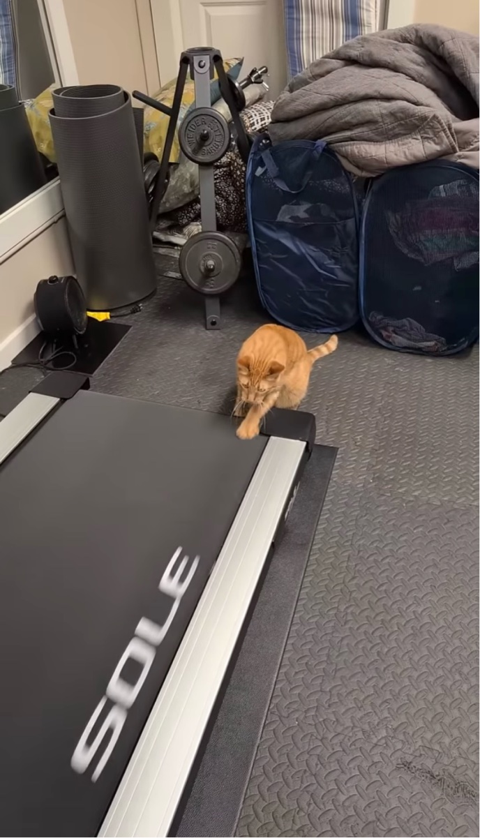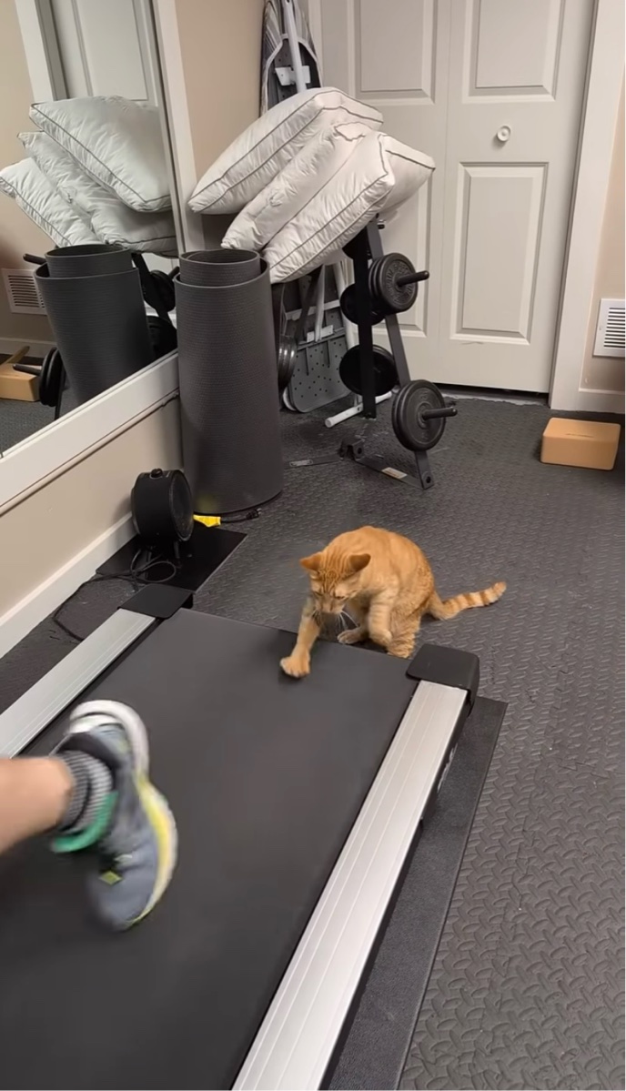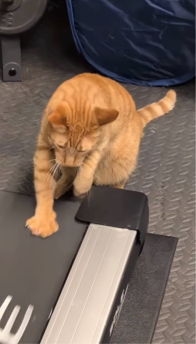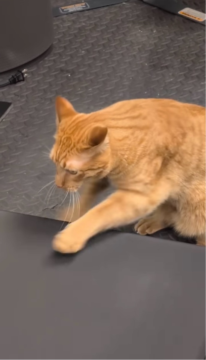 ランニングマシンで飼い主さんのマネをするようにおててを動かすネコ。
