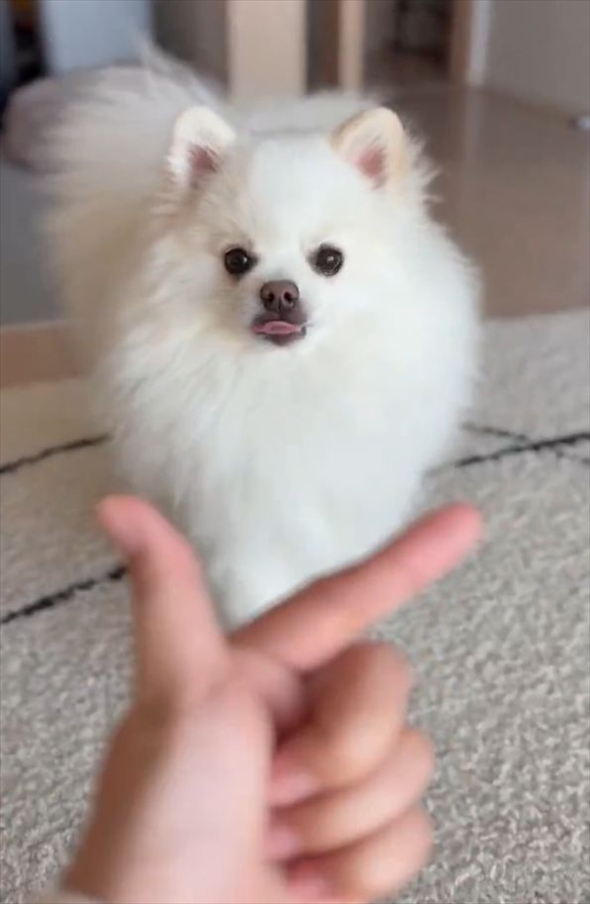 愛犬のポメラニアンに、指をVの字に開いた手を差し出した飼い主さん。