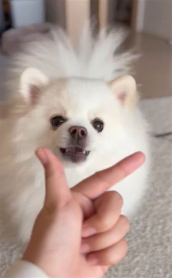 その手の先にいるのは、ポメラニアンの『天』くんです。