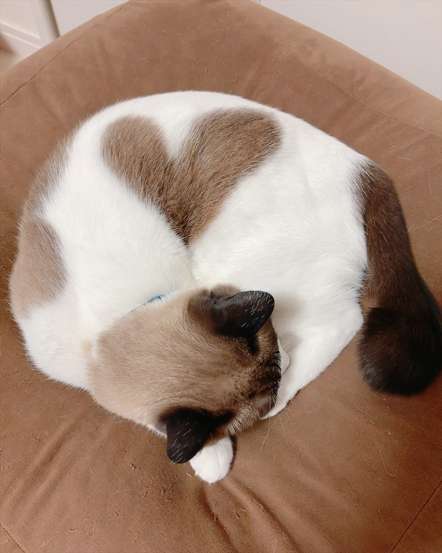 そして、ぽんちゃんが丸まる事で見れるようになるのが、うまい具合に模様が合わさってハートのマーク。