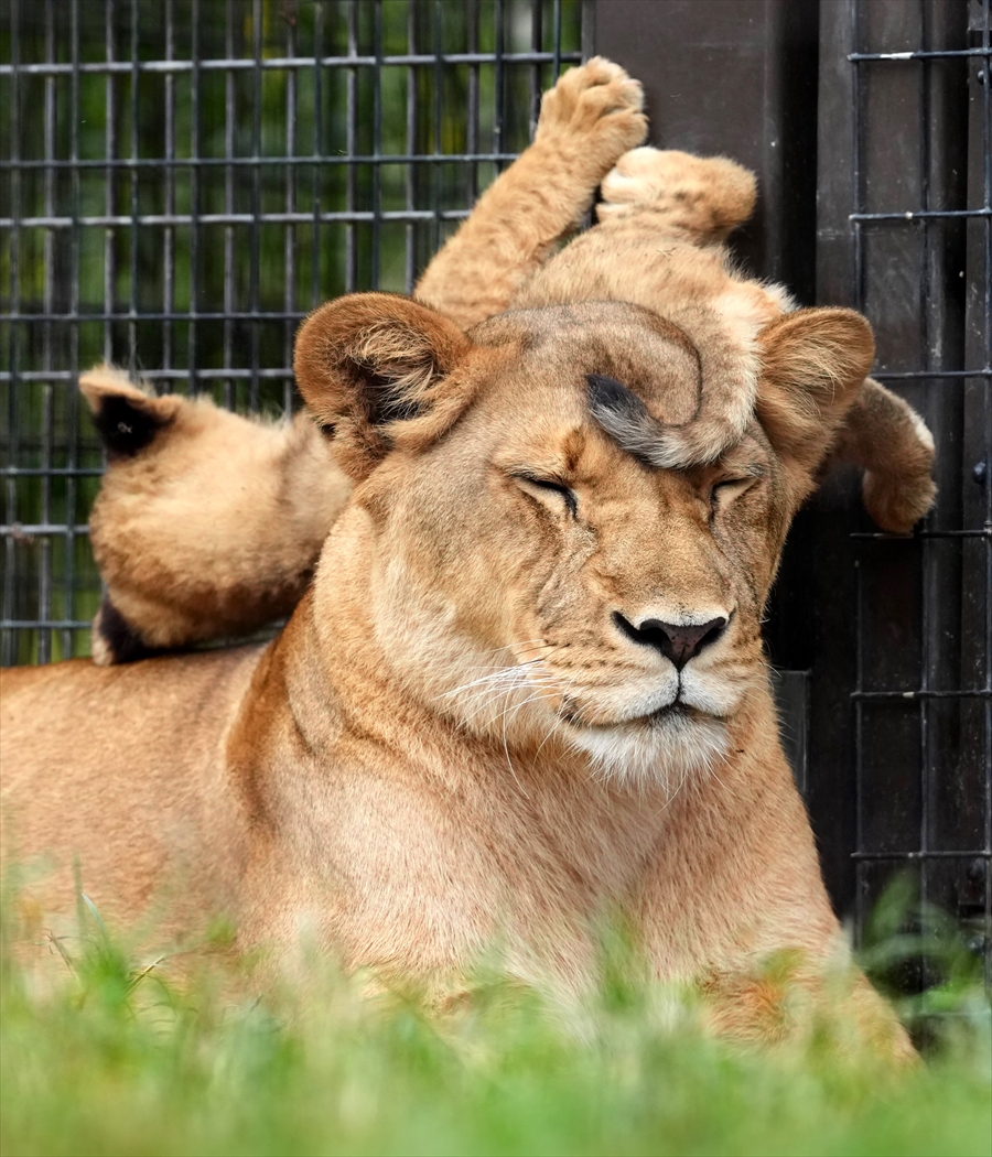 仔ライオンが母ライオンの頭の上で仰け反っていて、尻尾が母ライオンの顔にかかっています。