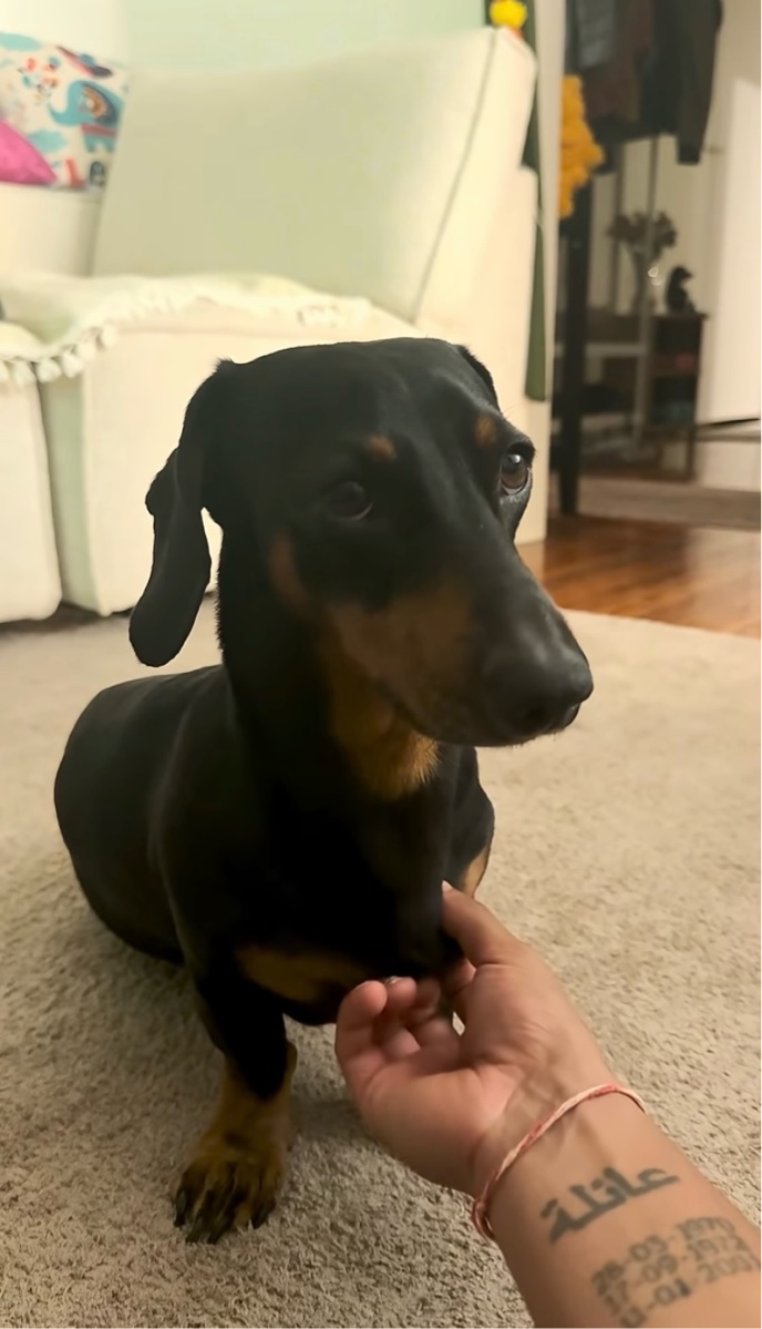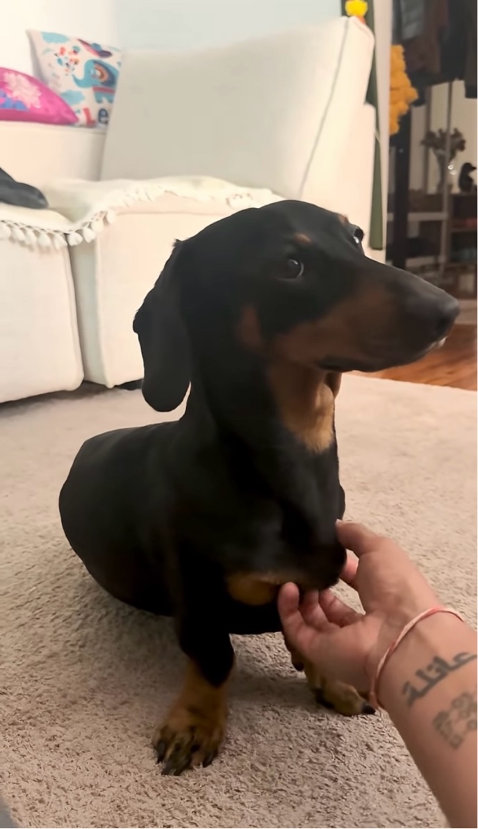 飼い主さんにカキカキしてもらって満足げなダックスフンドのモモ。
