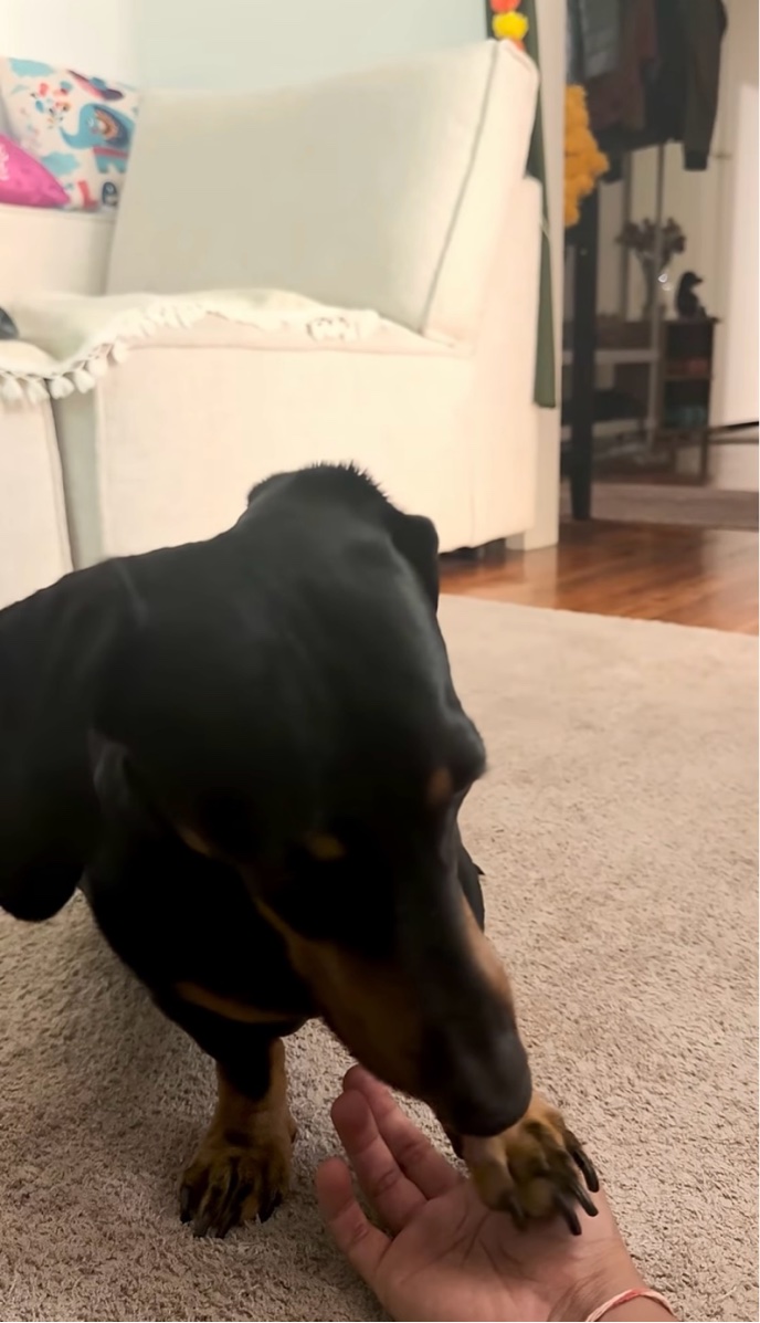飼い主さんにカキカキしてもらっているのは、5歳のダックスフンド『モモ』。