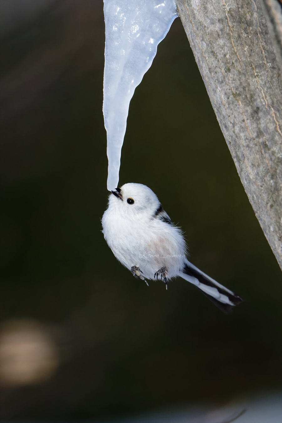 まるでシマエナガが氷柱にぶら下がっているようにも見えるこちらの写真。