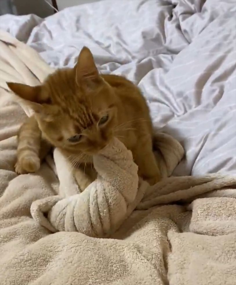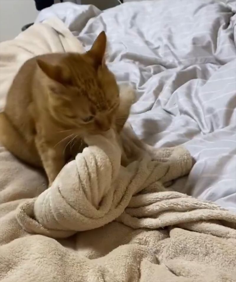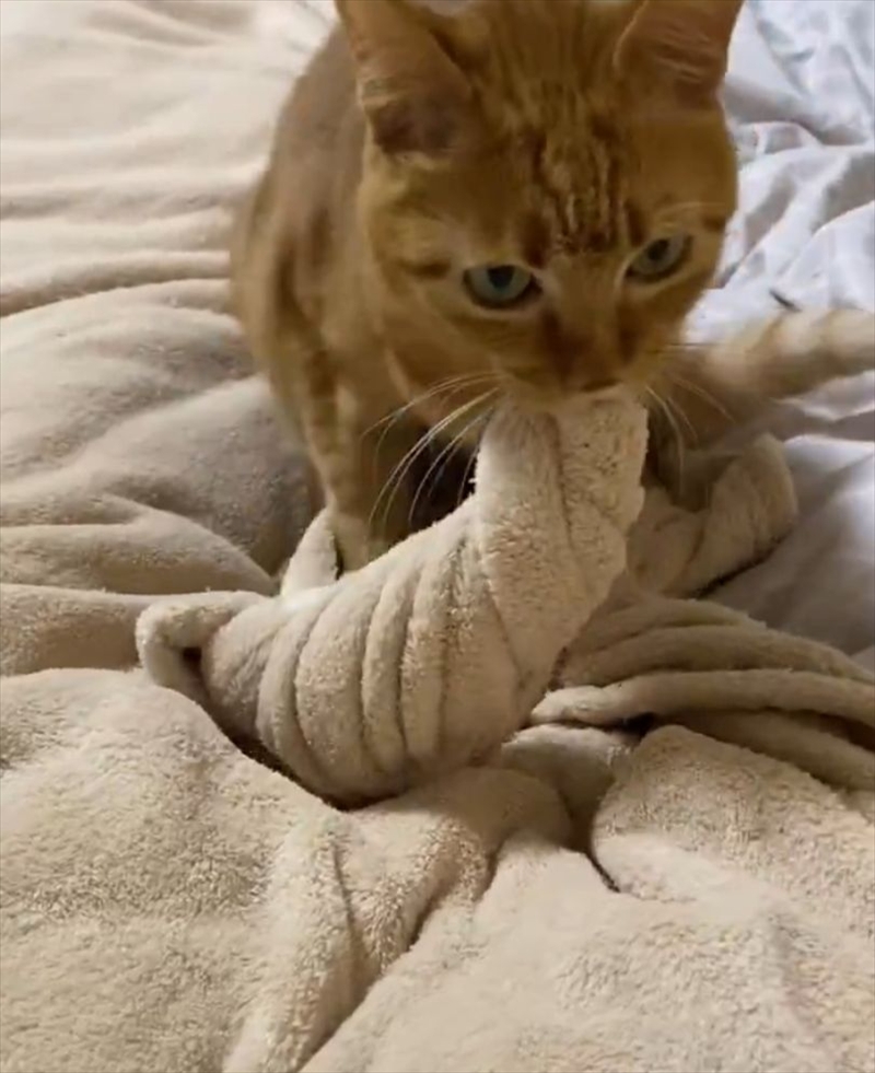静かだなと思ったら、タオルケットで特大ソフトクリームを作っていたネコ。