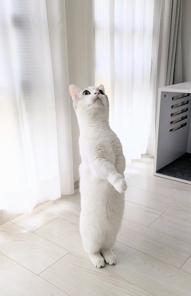 飼い主さんによると、「天井の火災報知機を突然見つけたようで、めっちゃ立ってました」とのこと。