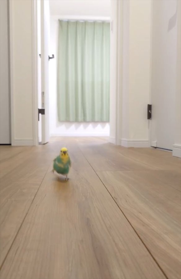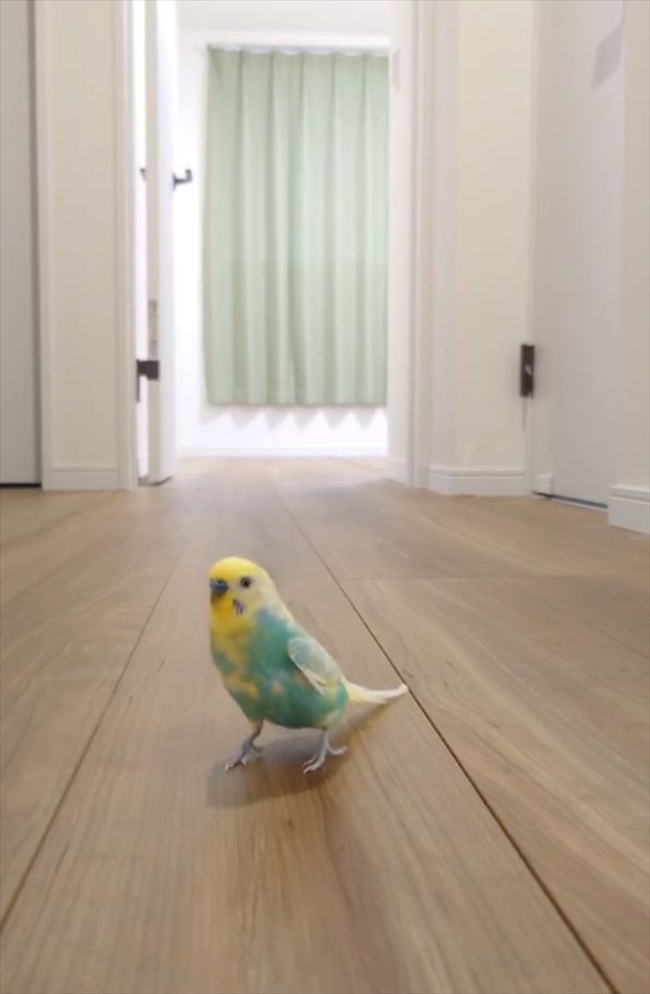 床に着陸すると、その勢いのまま走って来るこの子は、セキセイインコの『プリン』ちゃん。