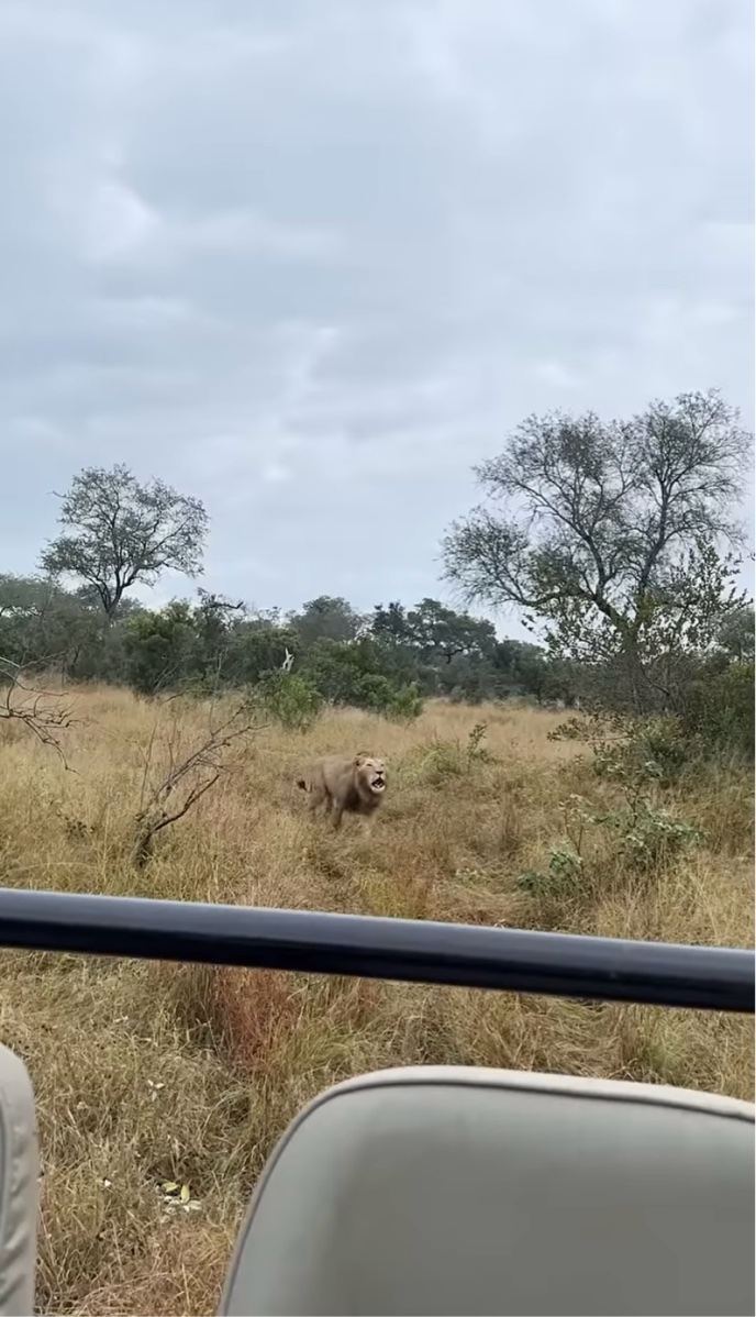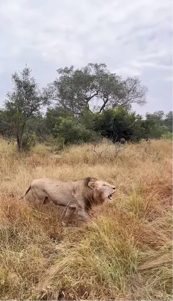 雄ライオンは力強く吠えながら、縄張りを堂々と歩き回っていますが、どうやらパトロールの真っ最中のようですね。