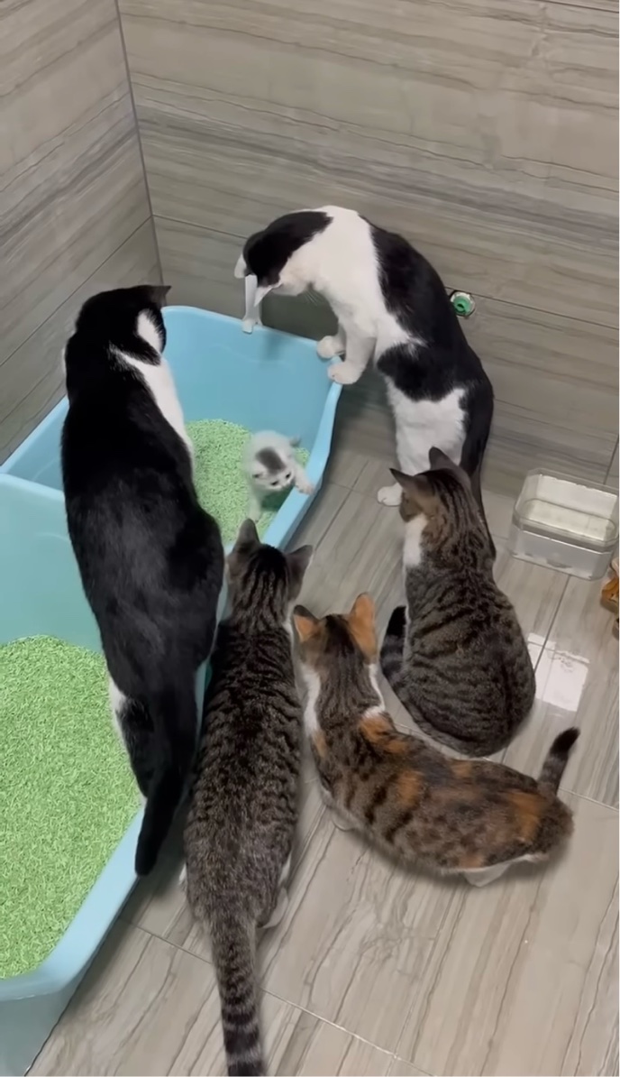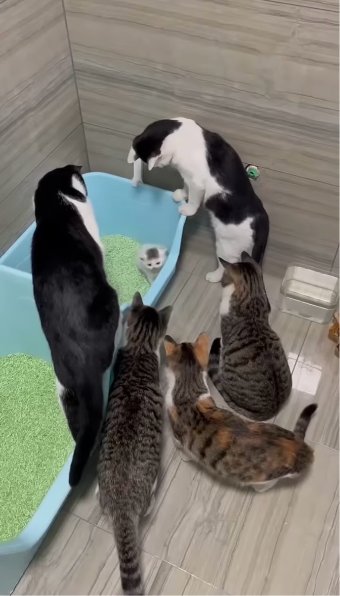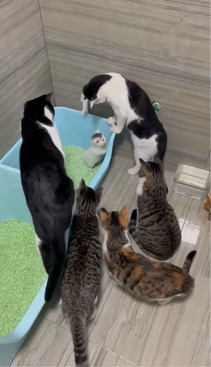 箱の中で動き回る子猫を、取り囲んで見守る5匹の成猫たち。
