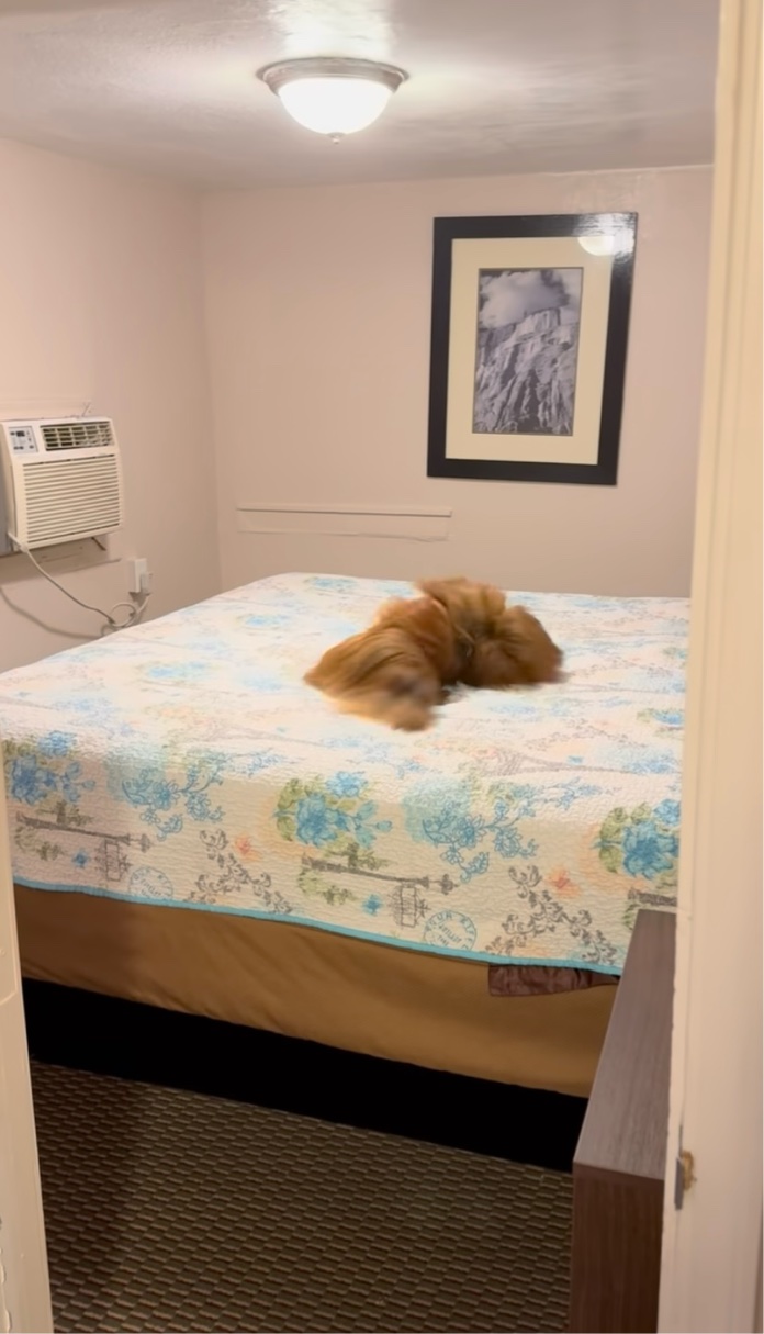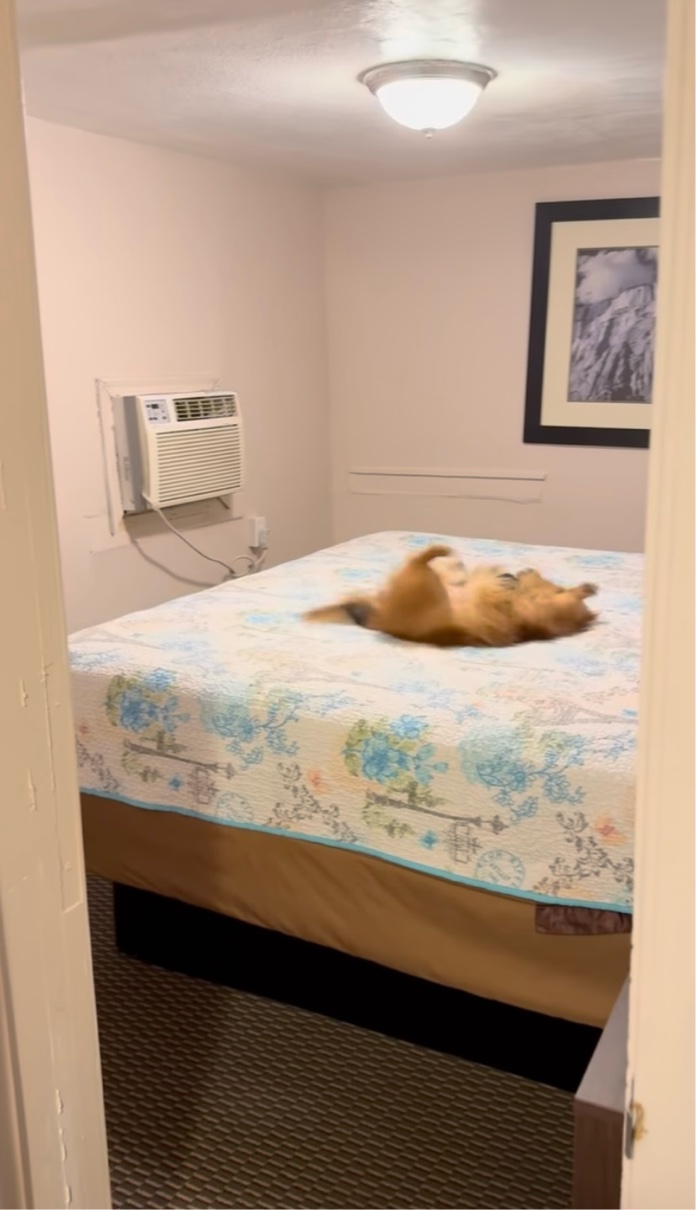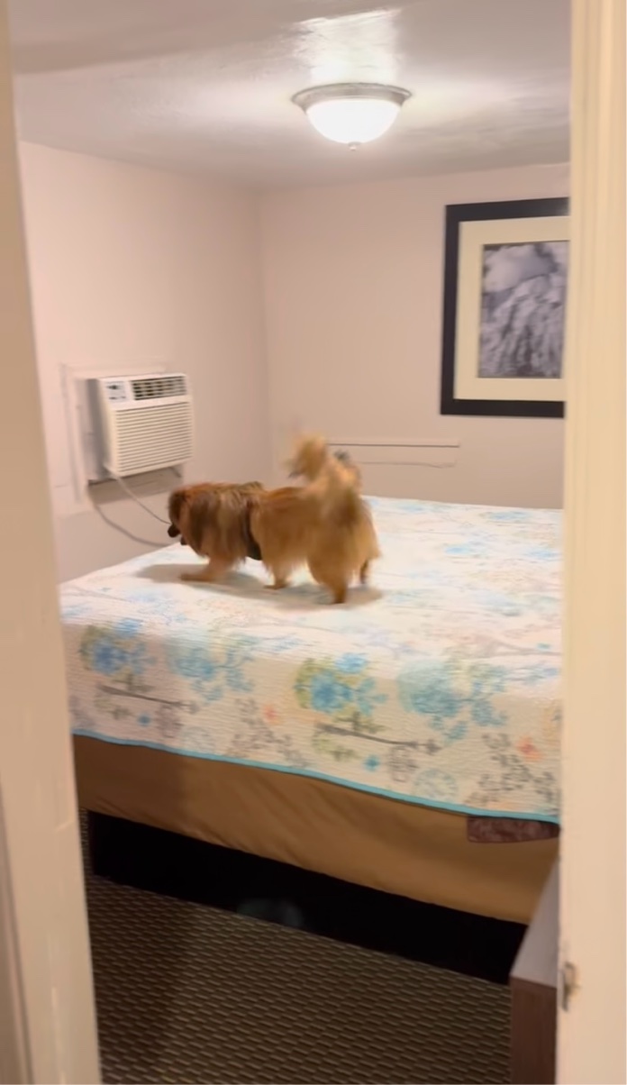 チェックインを済ませて部屋に入った撮影者さんは、愛犬が興味深い行動を取り始めたことに気付きました。