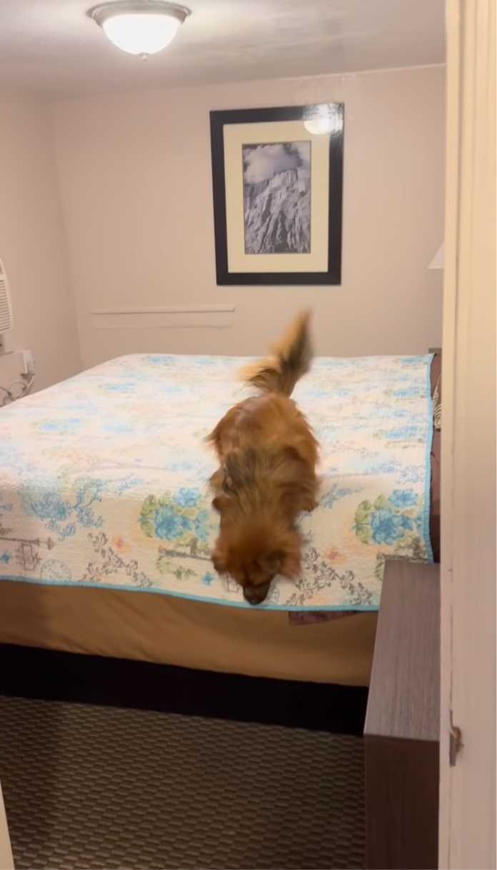 宿泊先のホテルのベッドを入念にチェックする愛犬。