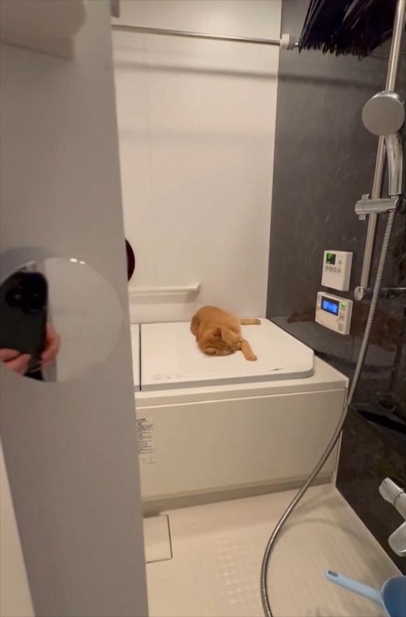 風呂に入ろうとしたところ、風呂場で熟睡していたネコを発見した飼い主さんの投稿が反響を呼んでいます!