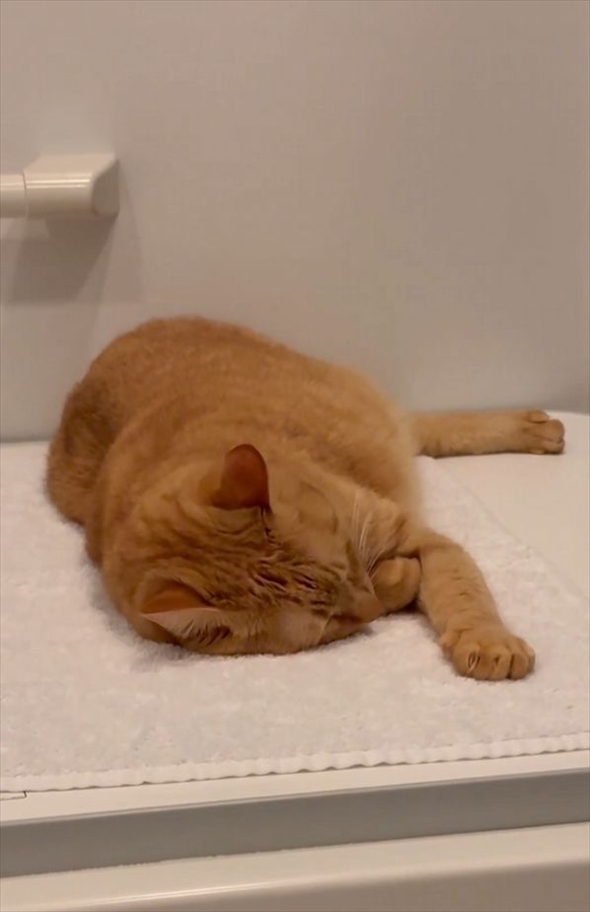 タオルが敷かれた浴槽のフタの上で、気持ち良さそうに眠っているようです。
