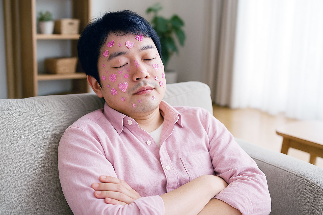 顔中ピンクとキラキラのシールだらけの自分。
