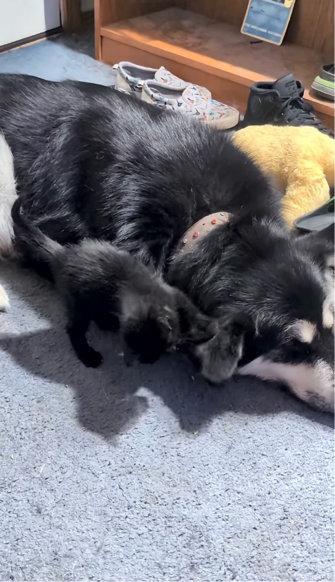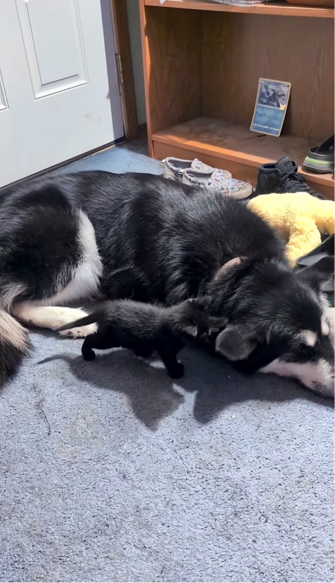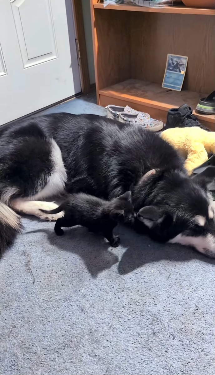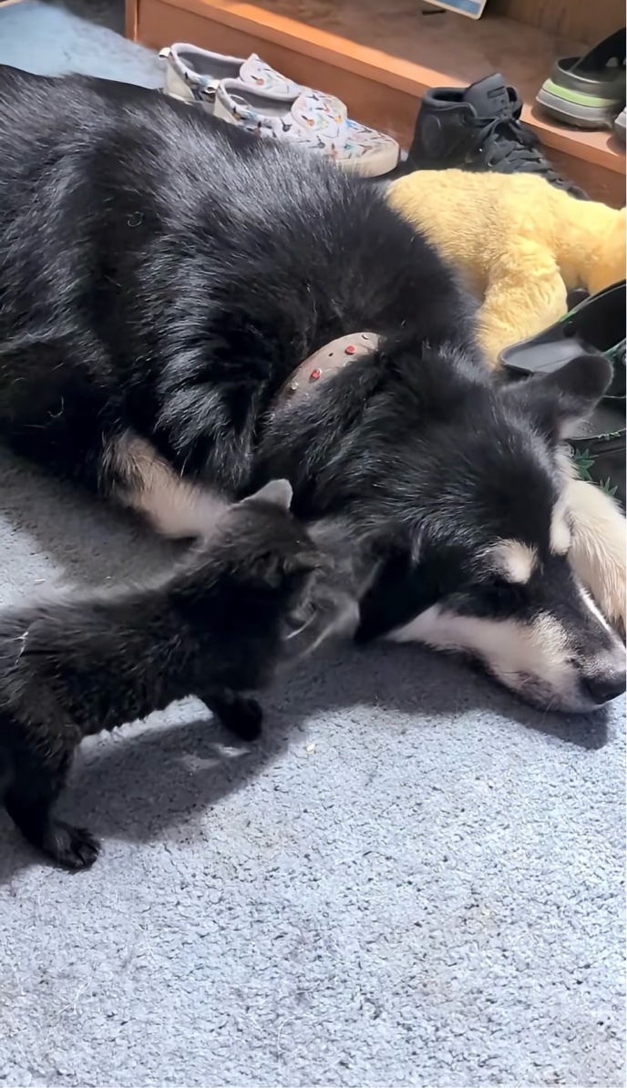 穏やかで優しいイヌと好奇心旺盛な子猫の微笑ましいやり取りが捉えられていました。