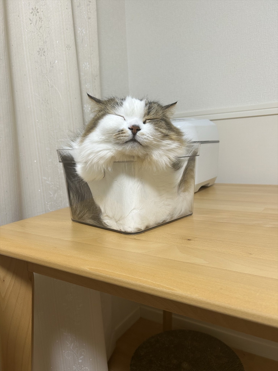 「ネコは液体」と言われることもありますが、こむぎくんも液体であるかのように箱におさまっていますね~。