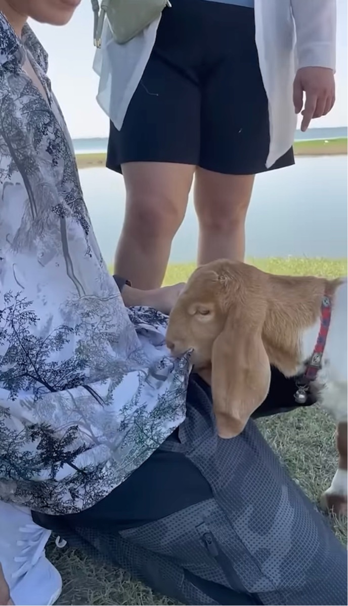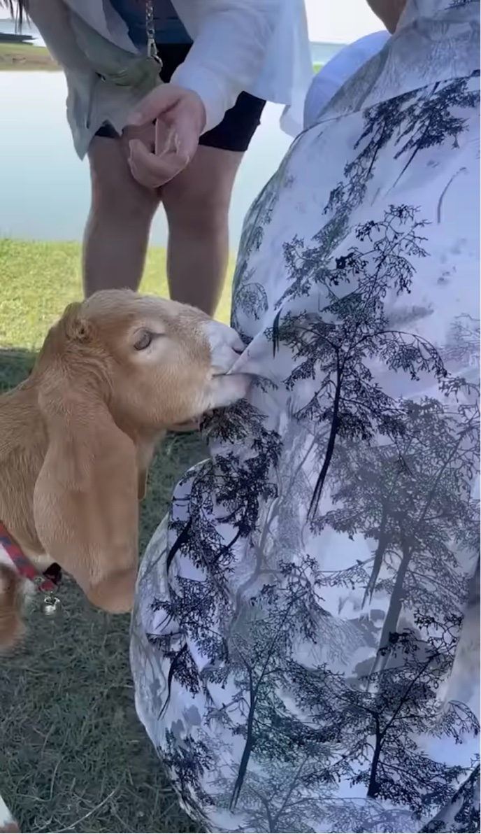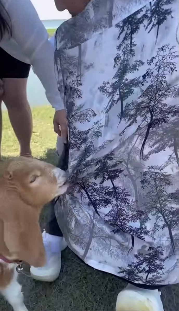 シャツに描かれた葉っぱのイラストを本物と勘違いしてムシャムシャするヤギ。