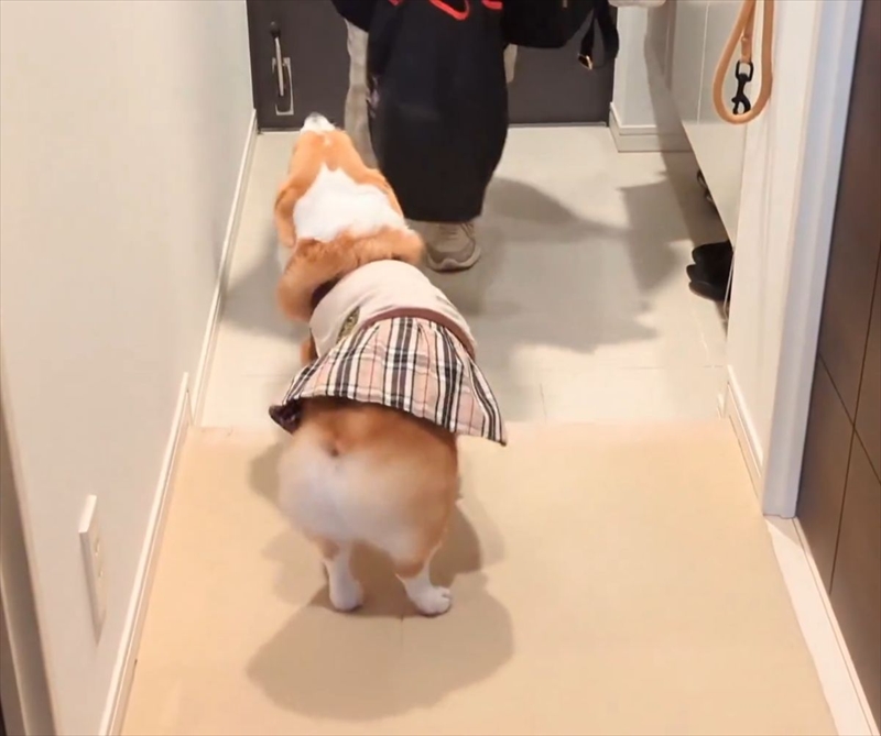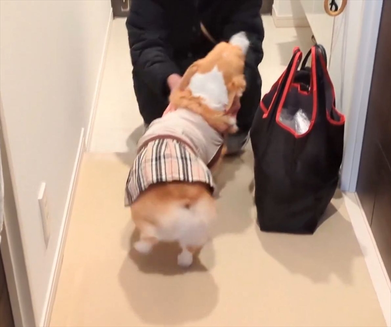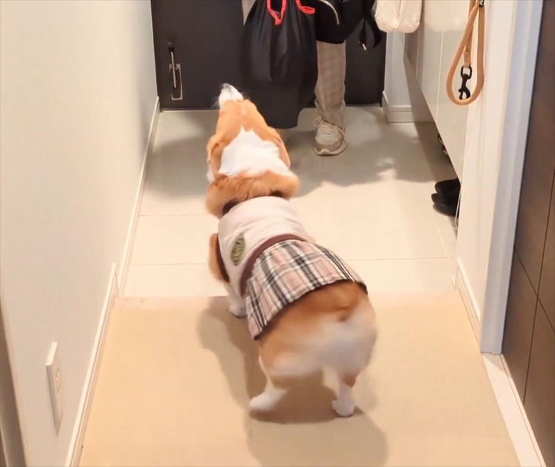 玄関でお尻をフリフリして喜びをあらわにしているのは、コーギーの『こまち』ちゃん。