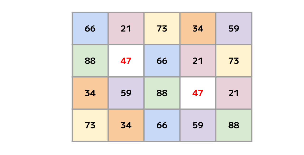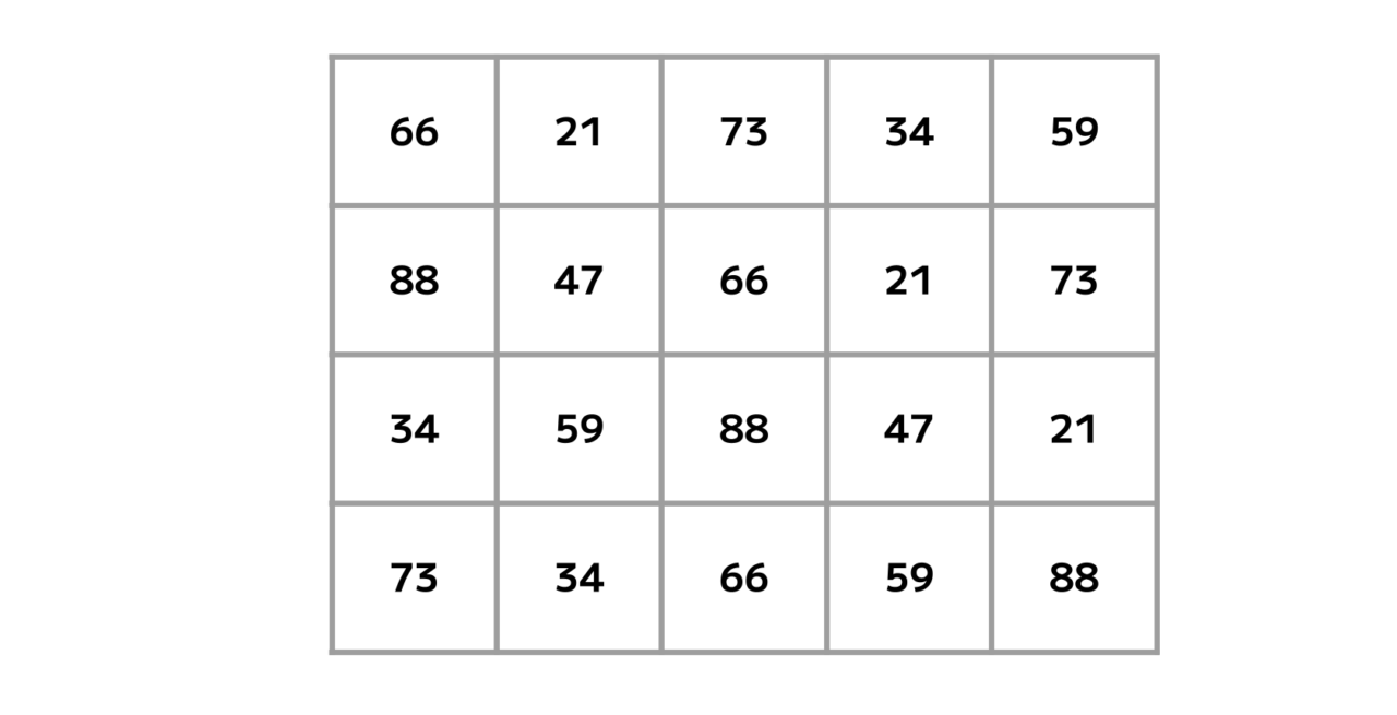 表を埋める「21・34・47・59・66・73・88」という7種の数字。