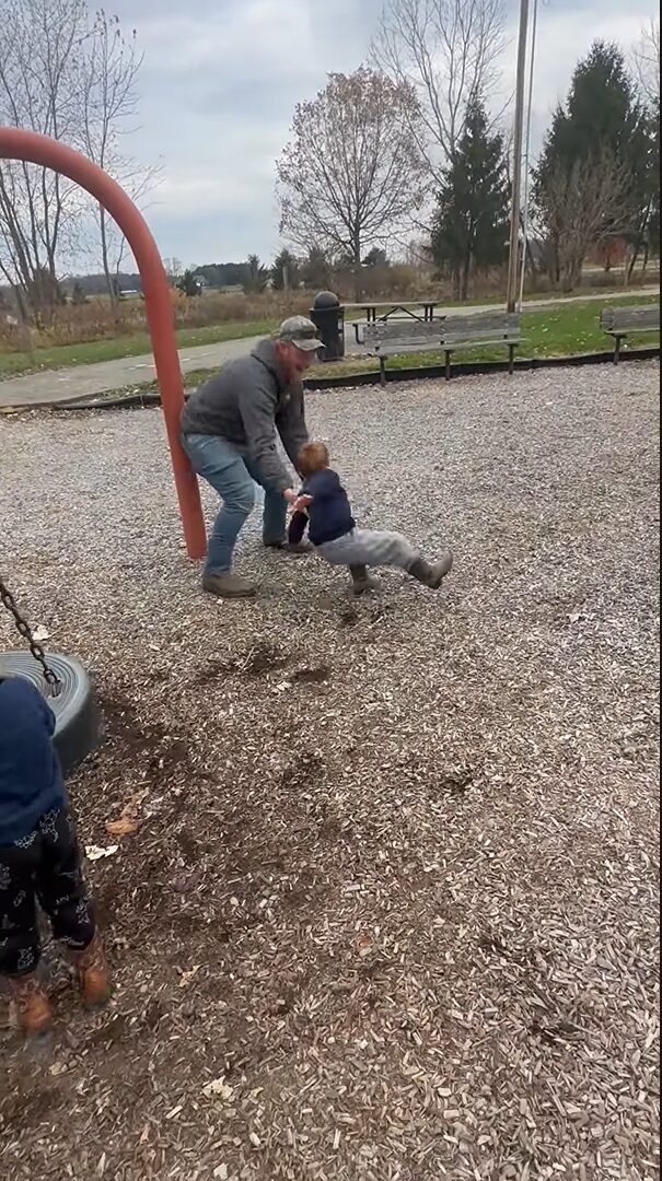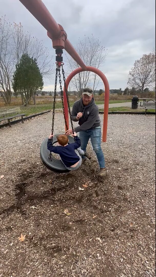 パパにブランコを押してもらって遊んでいた幼い男の子。