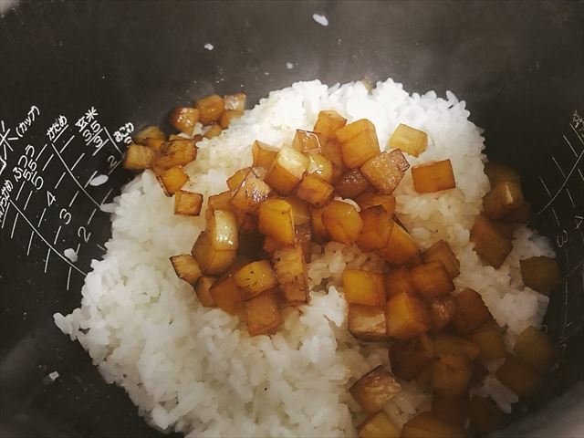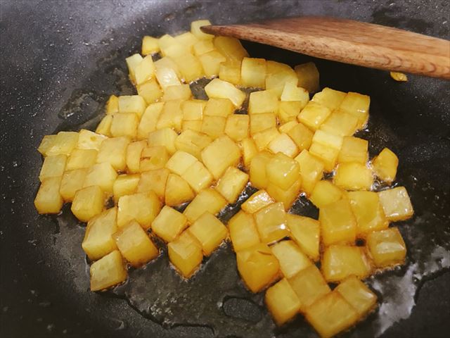 ほうほう、なるほど。1cm角に切った沢庵を多めの胡麻油が入ったフライパンで炒め、醤油で味付けするんですね。