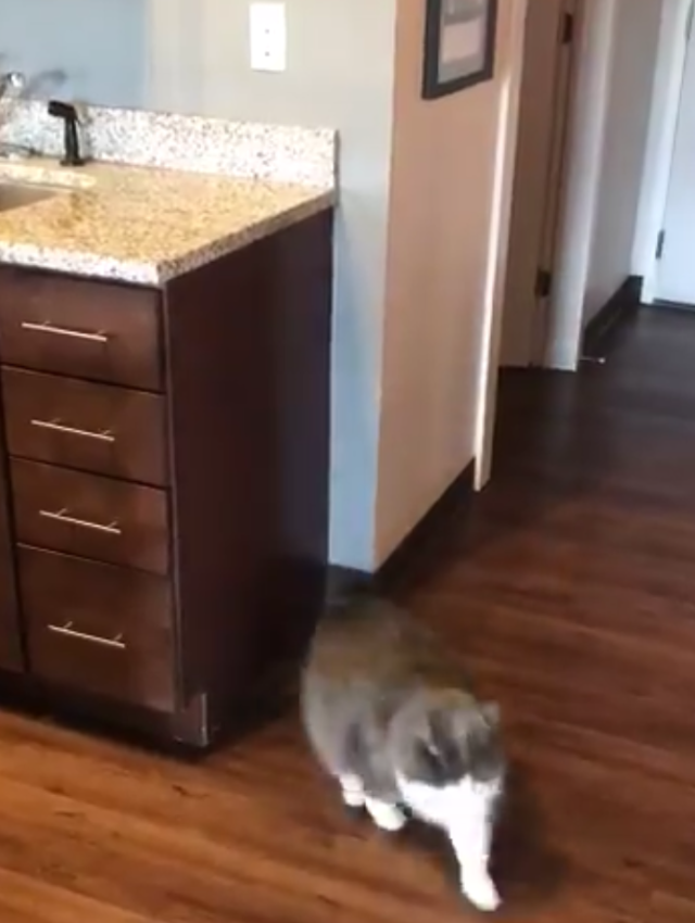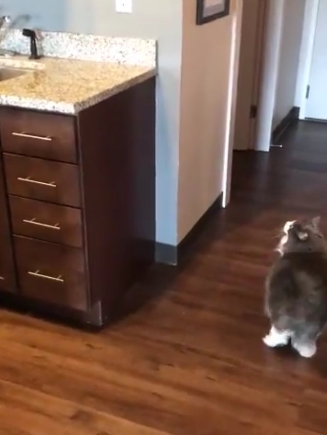 キッチンの側にやって来た一匹の猫ちゃんが、意を決したようにカウンターの上に向かってジャンプするのですが・・・