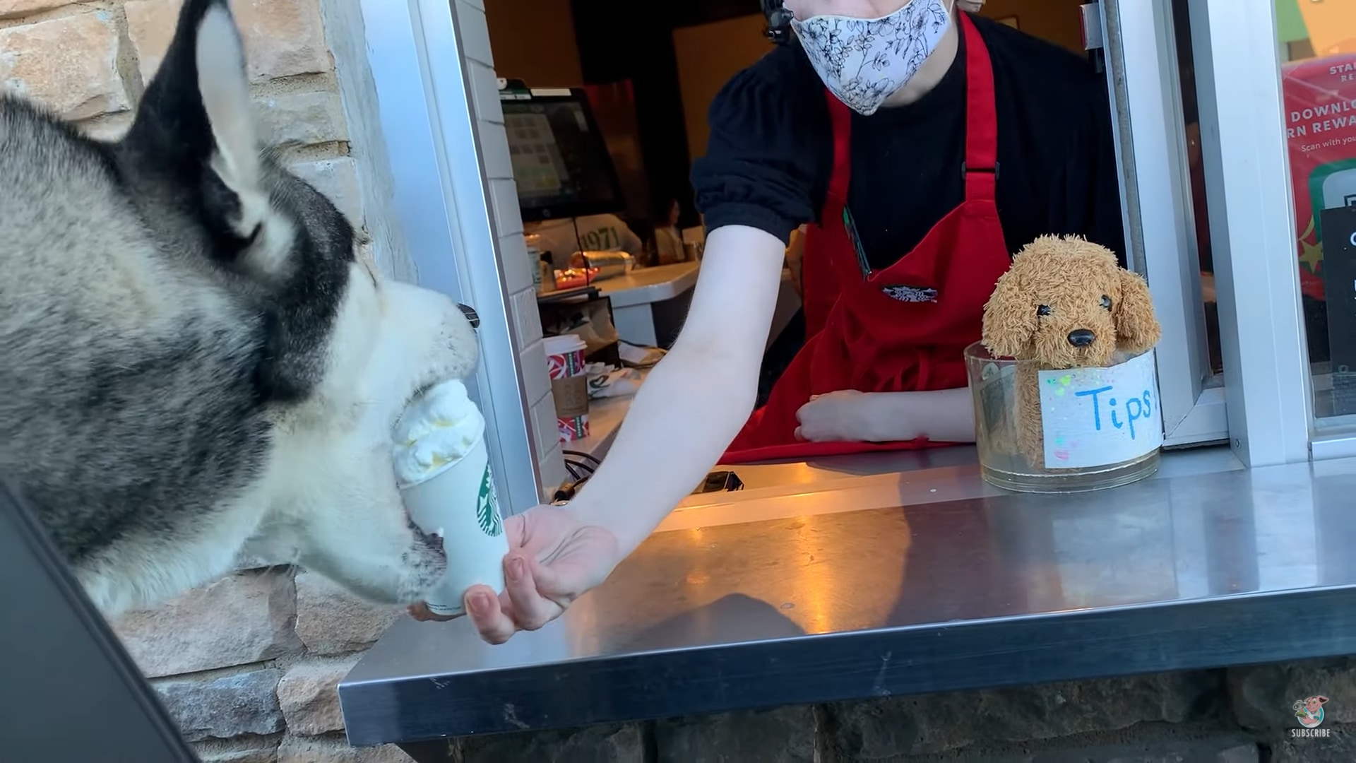 撮影者さんと一緒にお店を訪れたハスキーの子犬は、店員さんが作ってくれるパプカップが待ちきれなさそうな雰囲気です。