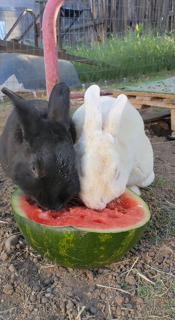今回ご紹介する動画では、2羽ののウサギたちがスイカを熱心に食べすすめる様子がとらえられていました。