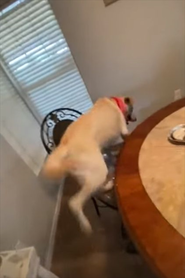 おいしそうなご馳走に興奮し、テーブルに飛び乗ろうとした愛犬。