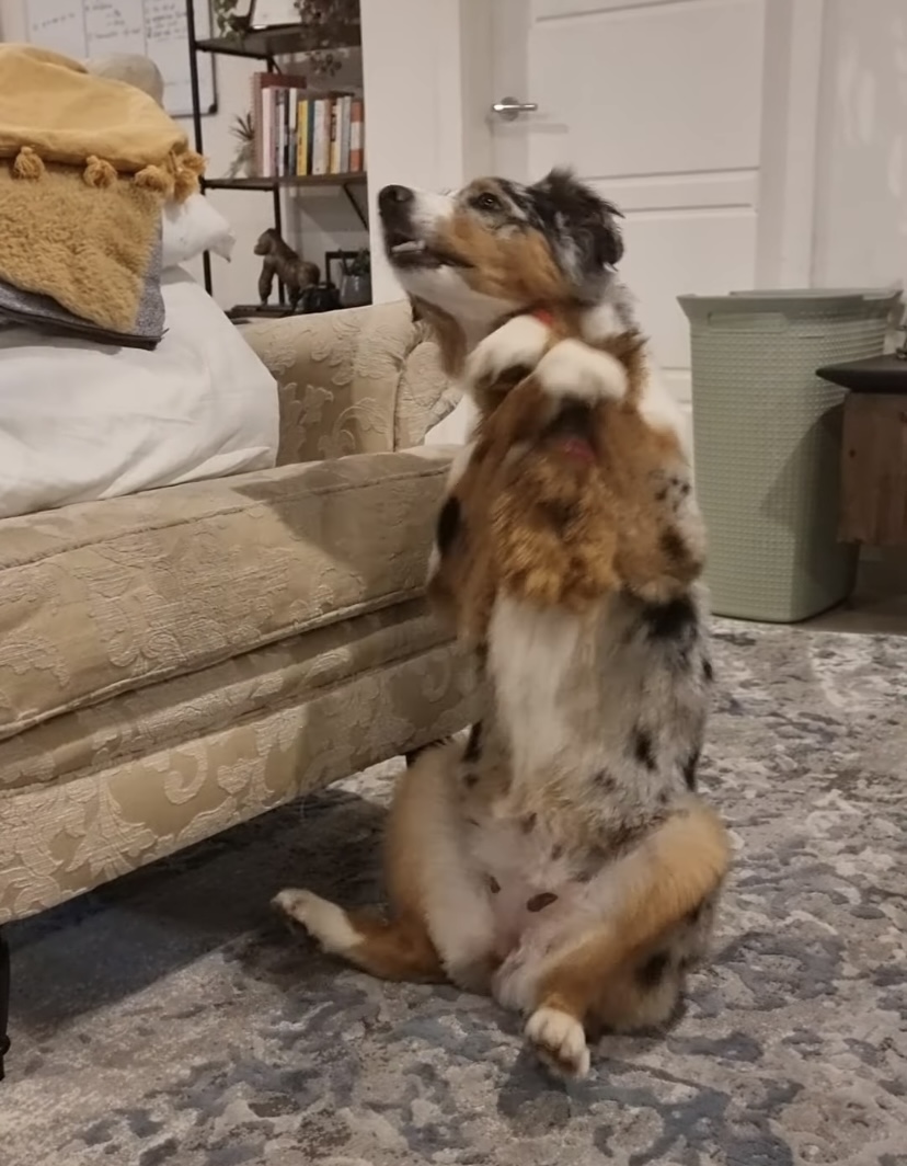 後ろ足で立ってぬいぐるみをギュッとハグした直後、ハプニングに見舞われた犬。