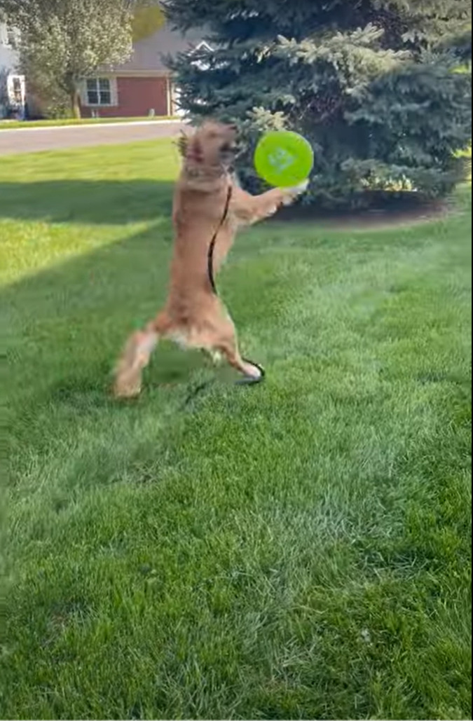 フリスビーを教わっているゴールデンリトリバーの子犬。飼い主さんの投げたフリスビーをキャッチできるかな?【アメリカ・動画】