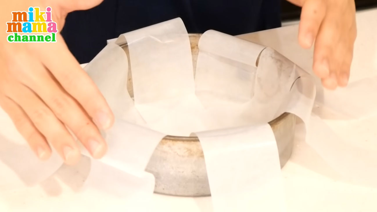 すき間ができないように、しっかり敷き詰めておくと、焼いた後型から外しやすくなるそうです。