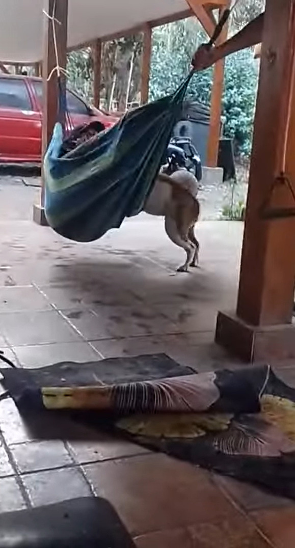 愛犬も一緒に乗り込んだハンモックを、そばにいた飼い主さんのお友達がユラユラ揺らします。